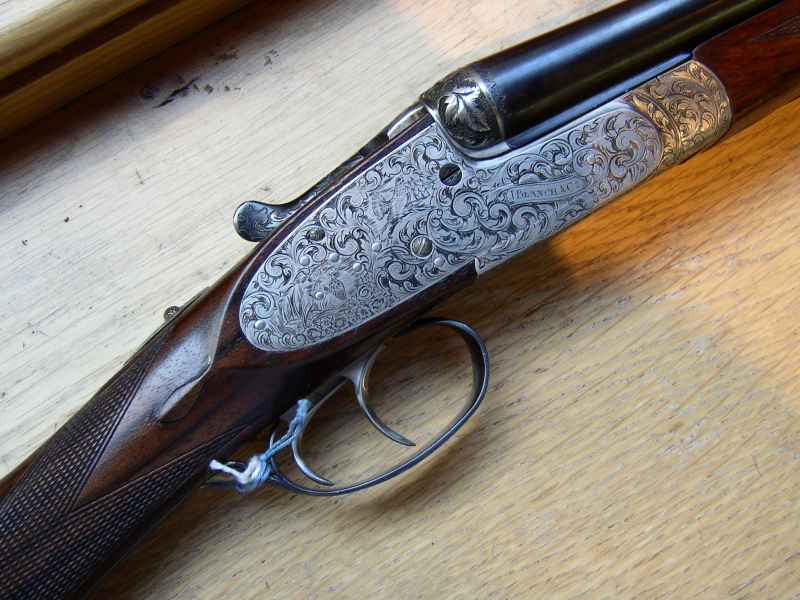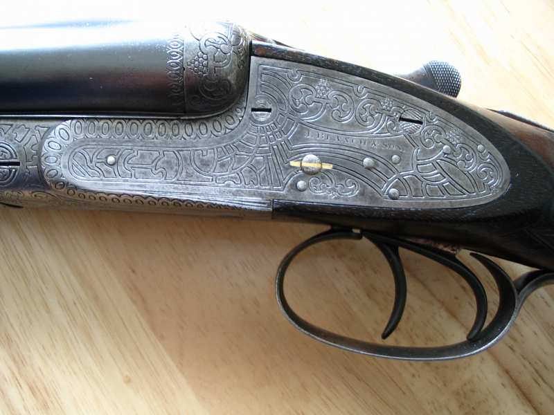 | 6685 | Photo | 12b Bar Action. 28" sleeved steel barrels. 'Whitworth Steel' and 'Centennial Model' on top rib. Patent 1212/44 on right action flat. 'J Blanch & Son Improved Snap Bolt' forend catch. Through front lump. | 1910 | 100% Bold Foliate Scroll | Figured SH 15 15/16" Entended with wood. | 6lb 11 1/2oz | Fine gun, possible Kell engraved. |