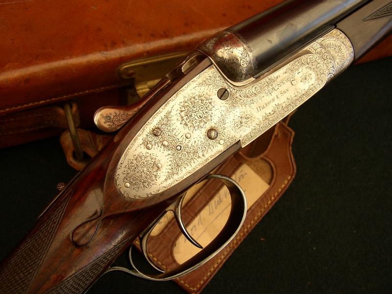 | 6645 | Photo | 16b Bar Action. 28" chopperlump BSA barrels with 2 1/2" chambers and 1/4 & Full chokes.JBSISB forend catch. | 1909 Engraved | 100% Bold Foliate | Highly figured SH 15 1/4" inc leather covered recoil pad. | UK | Ver fine gun. Full colour hardening (re-coloured?) Original leather case. |