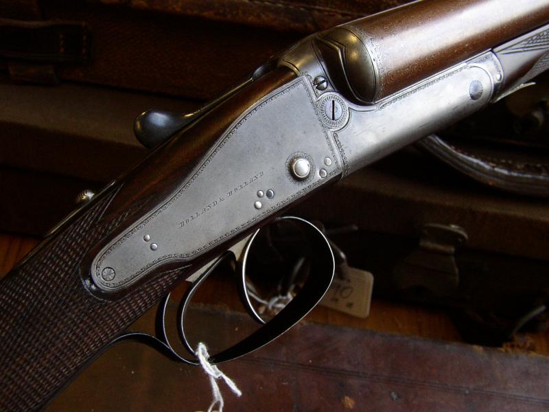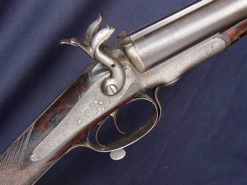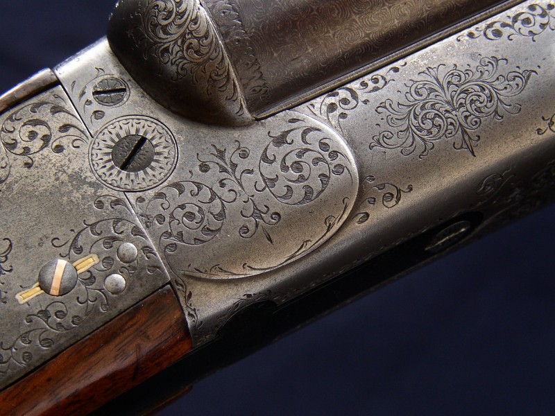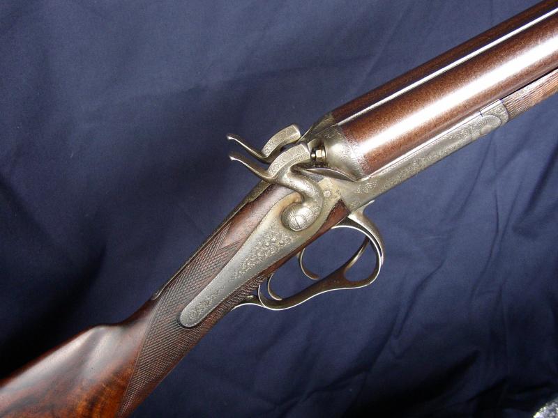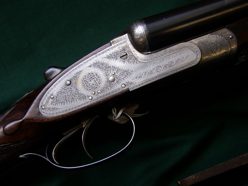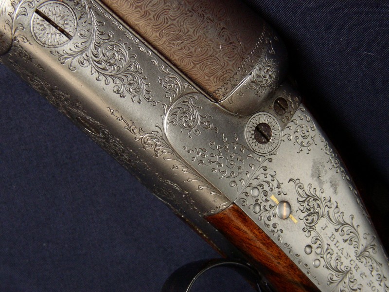 gun details and photos. The Gun Trade It should be understood by any student of the gun trade, mid 19th century to mid 20th century, that the trade was not organized quite as the public thought. With the exception of one or two of the most prestigious gun makers, guns were generally not 'made' by their vendors but by a host of small, highly skilled, anonymous gunmakers based principally in London and Birmingham. These largely unsung tradesmen could produce everything from a striker to a complete gun and supply the parts in any state from a rough forging to a fully finished gun complete with the vendors name and serial number. Furthermore, although some of the gun trade did specialize in a style or quality of gun, many could produce a product to any level of finish. The secret behind this fantastic level of flexibility was that most individuals specialised in one skill or another, be it barrel work, actioning, stocking, engraving or whatever, and the gun passed from tradesman to tradesman having the various procedures undertaken by a whole series of experts. The result was that virtually any gun in any bore, style and quality could be ordered within the trade. As I discuss below, this also means that you can find two almost identical guns that only really differ in the name engraved on the top rib and action. What says a lot about the quality of guns that were being supplied by the trade at the end of the 19th century are the prestigious names that turn up on them. Many pundits are pretty derogatory about the guns made within the Birmingham and provincial trade and it always makes me smile when they extol the virtues of guns such as Holland & Holland's Dominion back actions, which are arguable mainly of W C Scott origin! J Blanch and their position in the Trade. It has been said of J Blanch & Son that, although they undoubtedly sold elegant and finely finished guns, they were conservative in style and lacked the quest for innovation and progress that was apparent in other gunmakers of the time. Whether this is an accurate portrayal, depends on how you define conservative. If one was to define conservative as a tendency to stay with a tried and tested design and style and avoid technical embellishments, Blanch do fit the definition. However, if one was to define it as a willingness to conform with the mainstream of the gunmaking establishment then Blanch could be considered rather more radical. Looking
