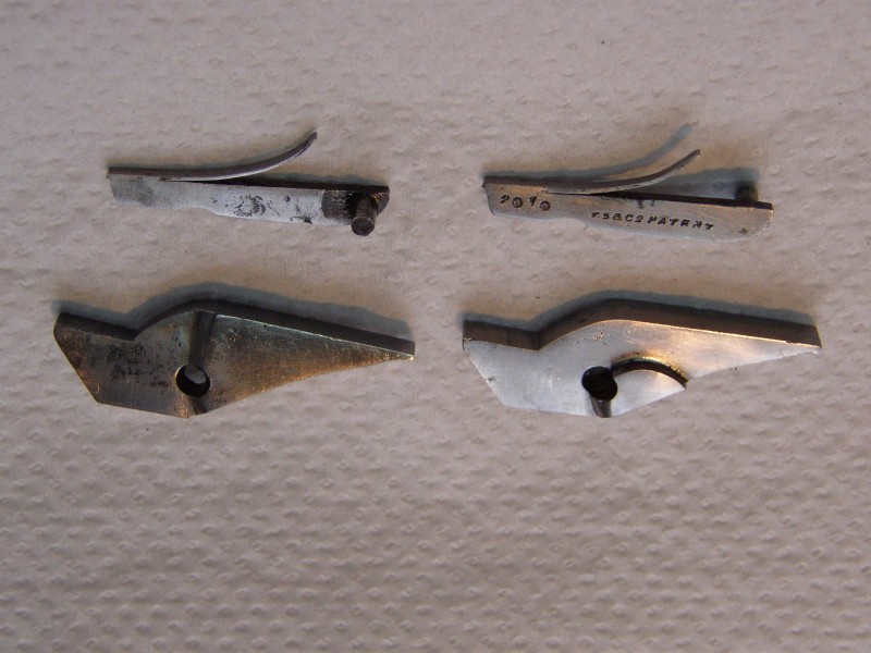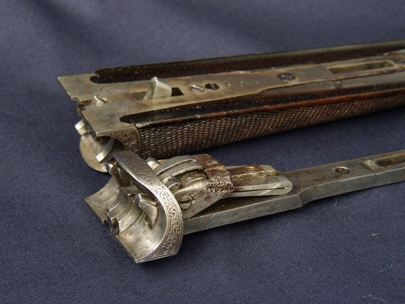 Forend Catch One point of interest is the forend catch found on nearly all the hammerless sidelocks and many of the hammer guns. This is a snap action lever catch apparently of a Deeley type but moved to the end of the forend and often engraved J Blanch & Sons Improved Snap Bolt. However, closer examination will show that it is more closely related to the Anson type catch as the pivoting lever operates a sliding bolt. This mechanism was patented by Scott, no. 615 of 1876, and demonstrates one more connection with the Scott gunmaking concern. The Improved seems to only refer to the more slender and elegant dimensions as in all other respects it is the Scott catch. Wood Although